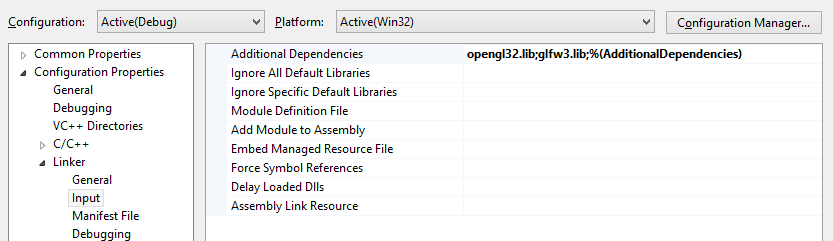 现在VS可以找到所需的所有文件了。最后需要在Linker(链接器)选项卡里的Input(输入)选项卡里添加glfw3.lib这个文件: