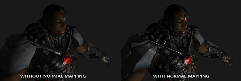 你可以看到在没有太多点的额外开销的情况下法线贴图难以置信地提升了物体的细节。