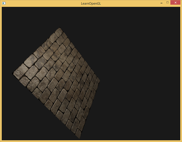 在一个简单的朝向正z轴的平面上,我们可以用这个diffuse纹理和这个法线贴图来渲染前面部分的图片。要注意的是这个链接里的法线贴图和上面展示的那个不一样。原因是OpenGL读取的纹理的y(或V)坐标和纹理通常被创建的方式相反。链接里的法线贴图的y(或绿色)元素是相反的(你可以看到绿色现在在下边);如果你没考虑这个,光照就不正确了(译注:如果你现在不再使用SOIL了,那就不要用链接里的那个法线贴图,这个问题是SOIL载入纹理上下颠倒所致,它也会把法线在y方向上颠倒)。加载纹理,把它们绑定到合适的纹理单元,然后使用下面的改变了的像素着色器来渲染一个平面: