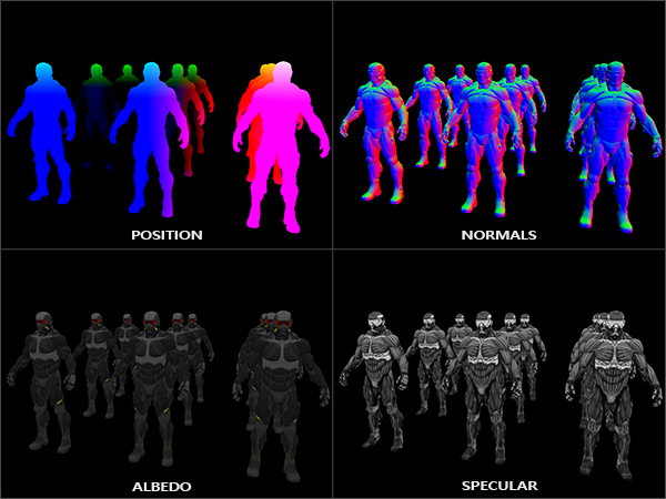 在几何处理阶段中填充G缓冲非常高效,因为我们直接储存像素位置,颜色或者是法线等对象信息到帧缓冲中,而这几乎不会消耗处理时间。在此基础上使用多渲染目标(Multiple Render Targets, MRT)技术,我们甚至可以在一个渲染处理之内完成这所有的工作。