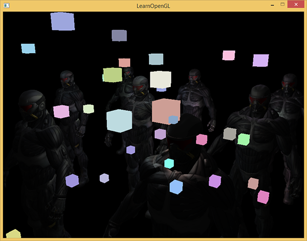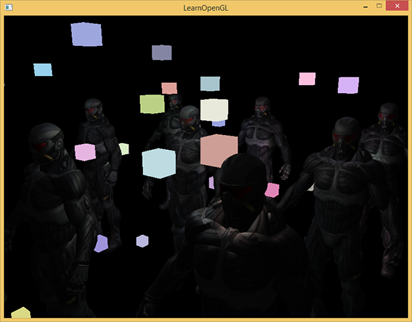 然而,这些渲染出来的立方体并没有考虑到我们储存的延迟渲染器的几何深度(Depth)信息,并且结果是它被渲染在之前渲染过的物体之上,这并不是我们想要的结果。