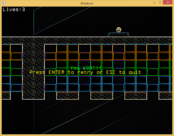在游戏激活状态,当关卡完成时,我们会重置游戏并且在GAME_WIN状态展示一条小的胜利的消息。为了增加趣味性我们会在GAME_WIN界面启用混沌效应。在函数Render中我们会祝贺玩家并询问其重新开始还是退出游戏。