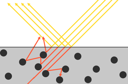 为了遵守能量守恒定律,我们需要对漫反射光和镜面反射光之间做出明确的区分。当一束光线碰撞到一个表面的时候,它就会分离成一个